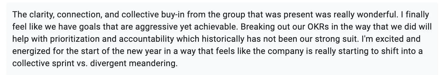 My favorite part was watching as we took the team's blob of dreams for the year and turned them into prioritized goals with ownership and check-ins.